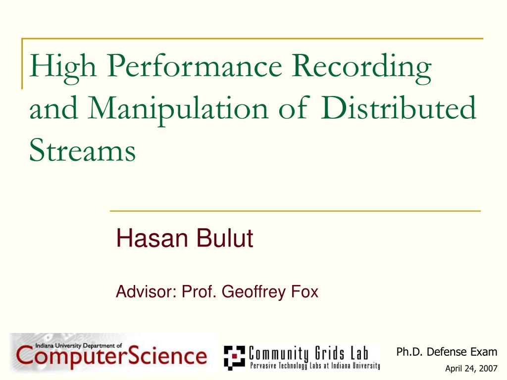 High Performance Recording and Manipulation of Distributed Streams Hasan Bulut Advisor: Prof. Geoffrey Fox Ph.D. Defense Exam April 24, 2007