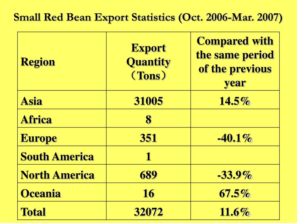II. Chinese Pulses Trade in 2006/2007 Crop Year • Small Red Bean From Oct. 2006 to Mar. 2007, Chinese export of small red bean amounted to 30,000 tons, a rise of 11.6% compared with the same period of the previous year, while export value was 16 million USD, an increase of 6.6% compared with the same period of the previous year.