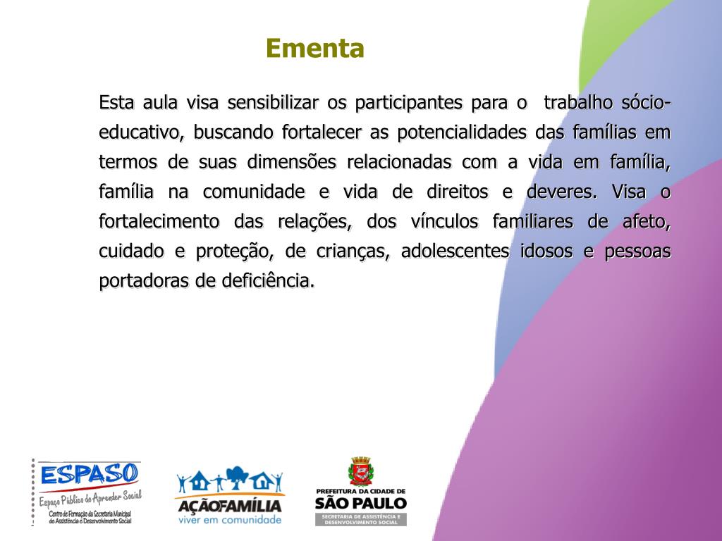 Ementa Esta aula visa sensibilizar os participantes para o trabalho sócio-educativo, buscando fortalecer as potencialidades das famílias em termos de suas dimensões relacionadas com a vida em família, família na comunidade e vida de direitos e deveres. Visa o fortalecimento das relações, dos vínculos familiares de afeto, cuidado e proteção, de crianças, adolescentes idosos e pessoas portadoras de deficiência.