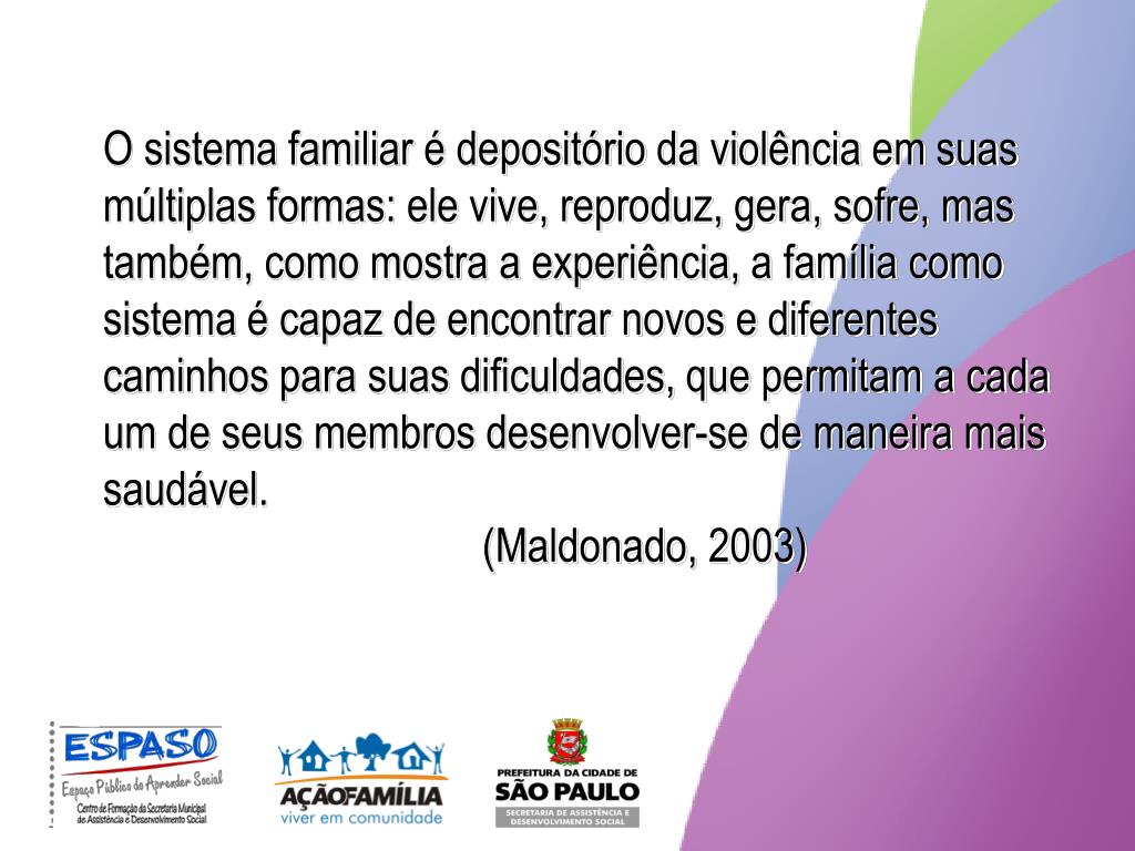 O sistema familiar é depositório da violência em suas múltiplas formas: ele vive, reproduz, gera, sofre, mas também, como mostra a experiência, a família como sistema é capaz de encontrar novos e diferentes caminhos para suas dificuldades, que permitam a cada um de seus membros desenvolver-se de maneira mais saudável. (Maldonado, 2003)