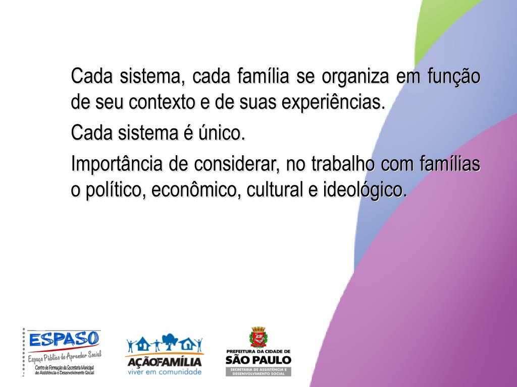 Cada sistema, cada família se organiza em função de seu contexto e de suas experiências. Cada sistema é único. Importância de considerar, no trabalho com famílias o político, econômico, cultural e ideológico.