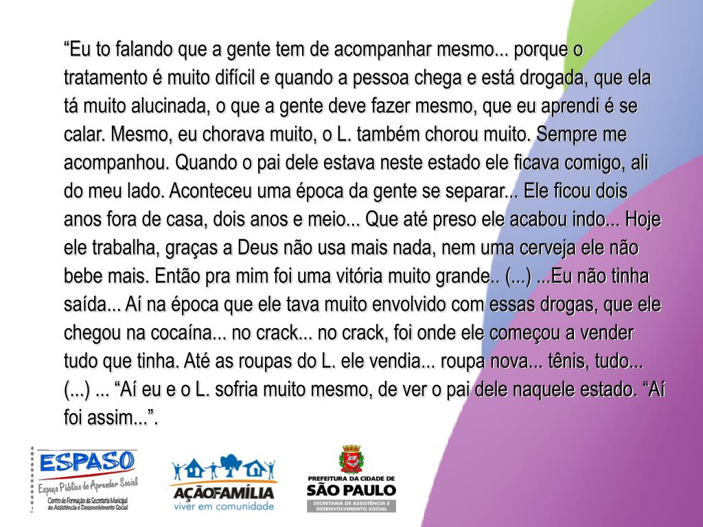 “Eu to falando que a gente tem de acompanhar mesmo... porque o tratamento é muito difícil e quando a pessoa chega e está drogada, que ela tá muito alucinada, o que a gente deve fazer mesmo, que eu aprendi é se calar. Mesmo, eu chorava muito, o L. também chorou muito. Sempre me acompanhou. Quando o pai dele estava neste estado ele ficava comigo, ali do meu lado. Aconteceu uma época da gente se separar... Ele ficou dois anos fora de casa, dois anos e meio... Que até preso ele acabou indo... Hoje ele trabalha, graças a Deus não usa mais nada, nem uma cerveja ele não bebe mais. Então pra mim foi uma vitória muito grande.. (...) ...Eu não tinha saída... Aí na época que ele tava muito envolvido com essas drogas, que ele chegou na cocaína... no crack... no crack, foi onde ele começou a vender tudo que tinha. Até as roupas do L. ele vendia... roupa nova... tênis, tudo... (...) ... “Aí eu e o L. sofria muito mesmo, de ver o pai dele naquele estado. “Aí foi assim...”.