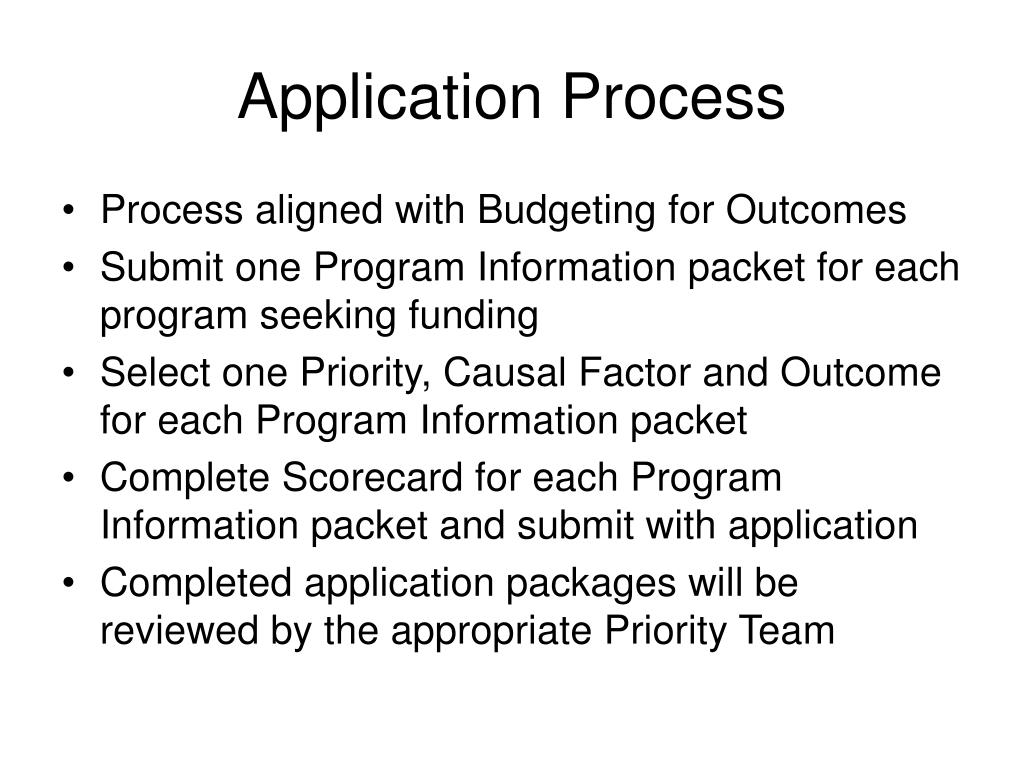 Application Process • Process aligned with Budgeting for Outcomes • Submit one Program Information packet for each program seeking funding • Select one Priority, Causal Factor and Outcome for each Program Information packet • Complete Scorecard for each Program Information packet and submit with application • Completed application packages will be reviewed by the appropriate Priority Team