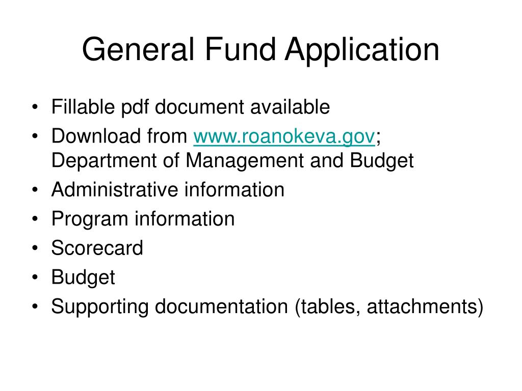 General Fund Application • Fillable pdf document available • Download from www.roanokeva.gov; Department of Management and Budget • Administrative information • Program information • Scorecard • Budget • Supporting documentation (tables, attachments)