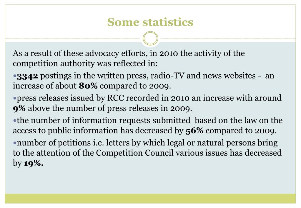 Some statistics As a result of these advocacy efforts, in 2010 the activity of the competition authority was reflected in: • 3342 postings in the written press, radio-TV and news websites - an increase of about 80% compared to 2009. • press releases issued by RCC recorded in 2010 an increase with around 9% above the number of press releases in 2009. • the number of information requests submitted based on the law on the access to public information has decreased by 56% compared to 2009. • number of petitions i.e. letters by which legal or natural persons bring to the attention of the Competition Council various issues has decreased by 19%.