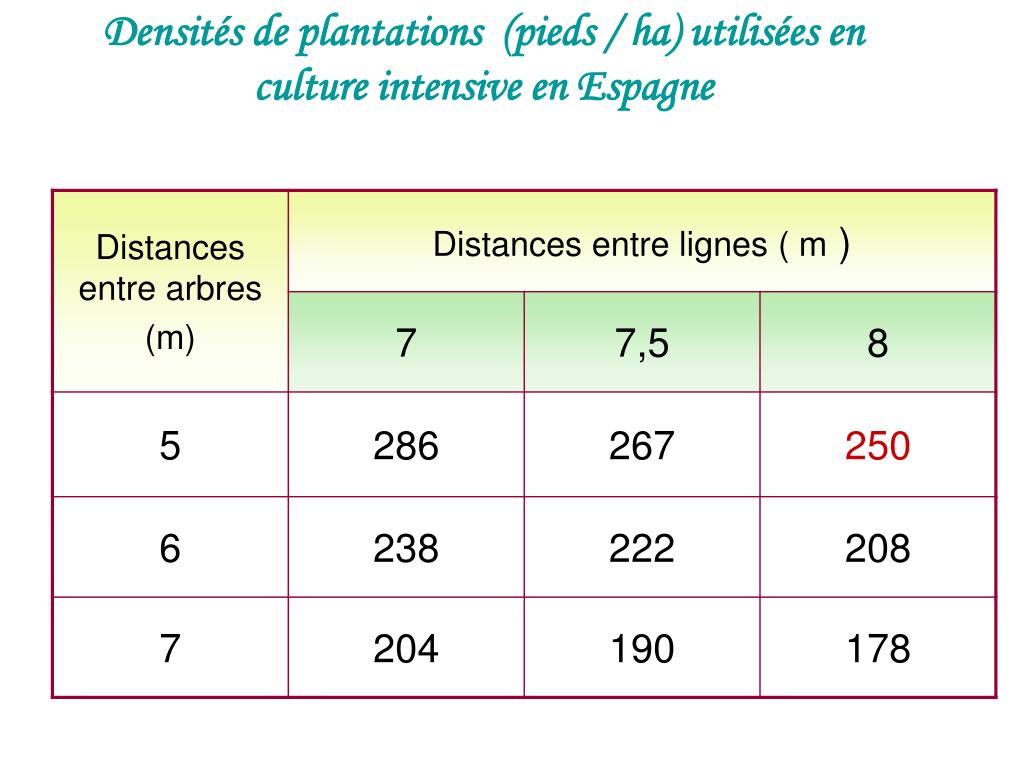 Exemples de densités super intensives • 7 m x 1,35 m : 1058 pieds / Ha (en sec) • 4 m x 2 m : 1250 pieds / Ha • 4 m x 1,5 m : 1666 pied / Ha • 4 m x 1,35 m : 1850 pieds / Ha • 4,25 m x 1,2 m : 1960 pieds / Ha • 3 m x 1, 5 m : 2222 pied / Ha • 3,68 x 0,92 m : 2960 pies / Ha (USA) Les plus utilisées