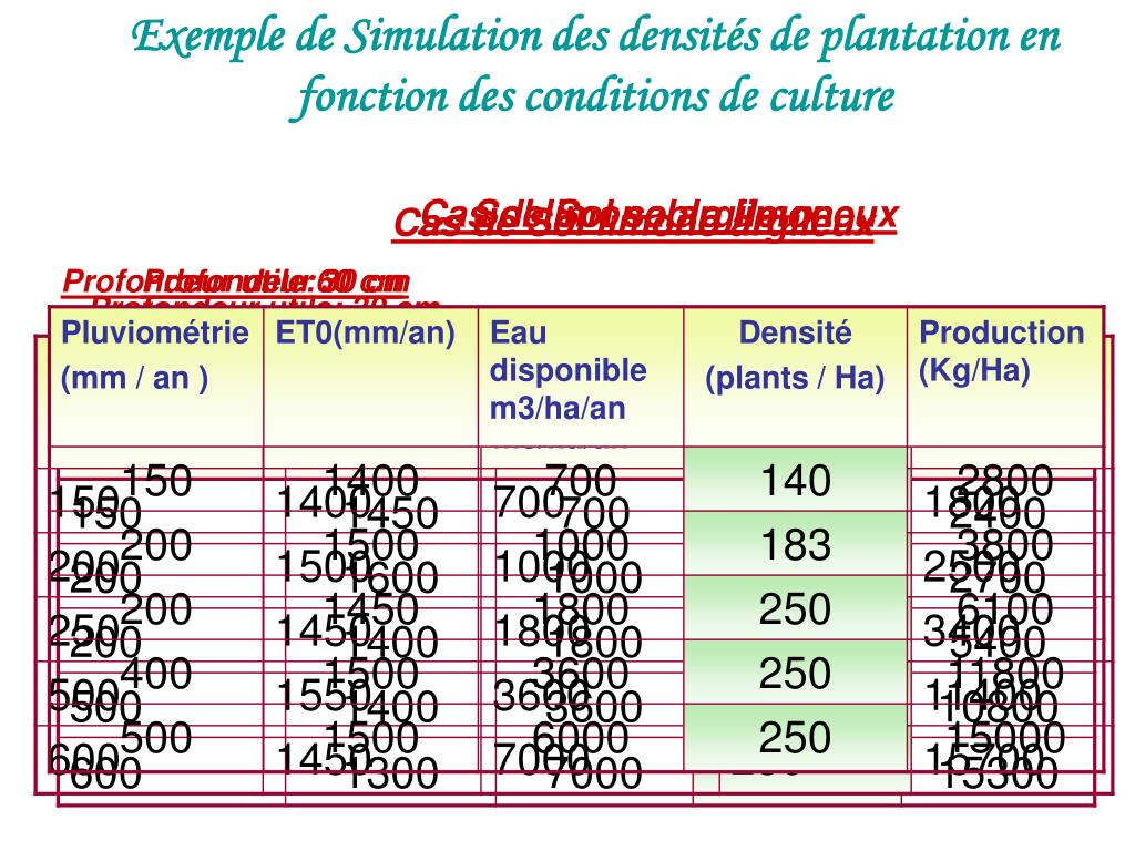 Exemple de Simulation des densités de plantation en fonction des conditions de culture Cas de Sol sablo limoneux Sol limono argileux Cas de Sol limono argileux Profondeur utile:60 cm Profondeur 30 cm Profondeur utile: 30 cm