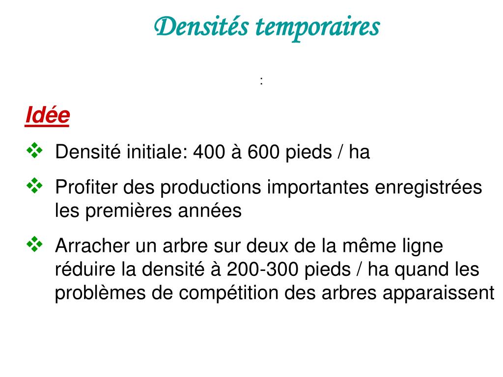 Densités temporaires • : • Idée • Densité initiale: 400 à 600 pieds / ha • Profiter des productions importantes enregistrées les premières années • Arracher un arbre sur deux de la même ligne réduire la densité à 200-300 pieds / ha quand les problèmes de compétition des arbres apparaissent