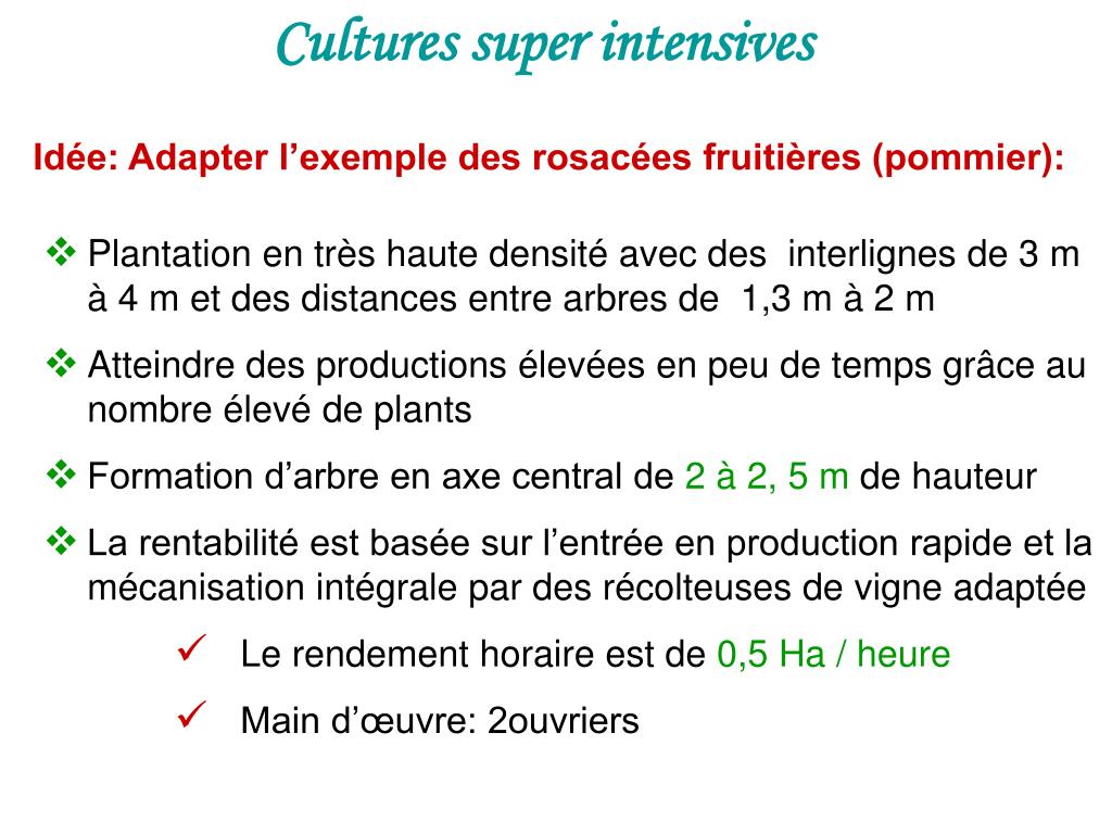 Cultures super intensives Idée: Adapter l’exemple des rosacées fruitières (pommier): • Plantation en très haute densité avec des interlignes de 3 m à 4 m et des distances entre arbres de 1,3 m à 2 m • Atteindre des productions élevées en peu de temps grâce au nombre élevé de plants • Formation d’arbre en axe central de 2 à 2, 5 m de hauteur • La rentabilité est basée sur l’entrée en production rapide et la mécanisation intégrale par des récolteuses de vigne adaptée • Le rendement horaire est de 0,5 Ha / heure • Main d’œuvre: 2ouvriers