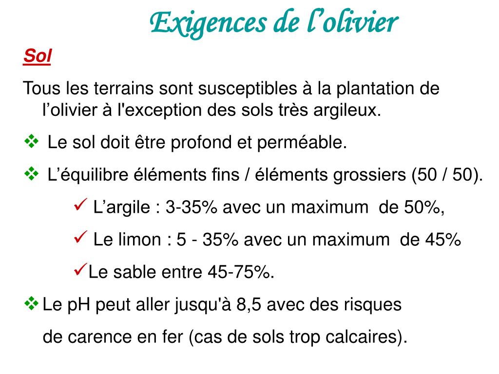 Exigences de l’olivier • Sol Tous les terrains sont susceptibles à la plantation de l’olivier à l'exception des sols très argileux. • Le sol doit être profond et perméable. • L’équilibre éléments fins / éléments grossiers (50 / 50). • L’argile : 3-35% avec un maximum de 50%, • Le limon : 5 - 35% avec un maximum de 45% • Le sable entre 45-75%. • Le pH peut aller jusqu'à 8,5 avec des risques de carence en fer (cas de sols trop calcaires).