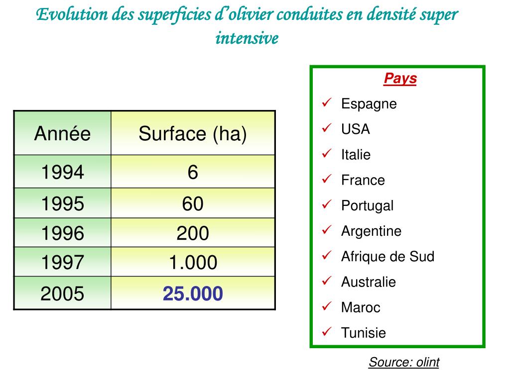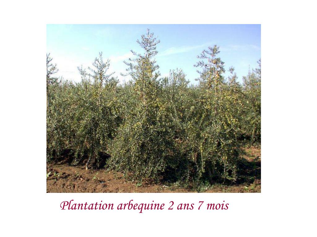 Polémique au sujet des densités super intensives • « POUR » • Entrée en production rapide • Meilleurs récoltes • Meilleure rentabilité • Durée de vie: 20 ans • Coûts de récolte réduits • Production d’huile de bonne qualité • « CONTRE » • Investissement lourds • Conduite difficile et coûteuses • Durée de vie courte • Gamme variétale réduite • Gain de production de seulement 15 % • Coût de récolte élevés Les plantations d'oliviers avec une haute densité sont prometteuses, mais exigent le développement de variétés nouvelles génétiquement naines ou de porte greffes nanisant.