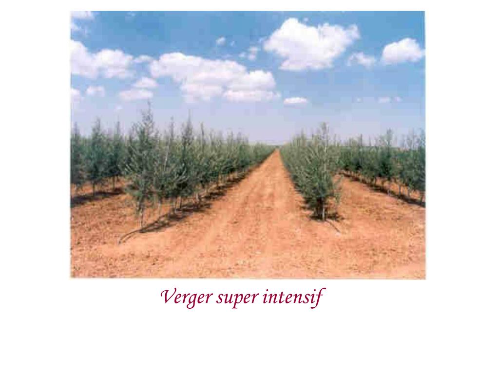 Recommandations pour la réussite des plantations super intensives d’olivier (Vossen, 2005) • Terrain , bien drainé,pente légère, texture équilibrée, peu profond et pas très fertile • Variétés: connues: Arbequine, Arbosana et Koreneiki et autres • Ecartements: dépendent du climat et de la fertilité du sol • min 3 ft x 12 ft; soit 0,92 m x 3,68 m : 2950 P / Ha • Max 4 ft x 14 ft soit 1,2 m x 4,25 m (Terrain fertile): 1960 P /Ha • Conduite: • 2-3 premières années: maintenir l’ humidité abondante, fertilisation adéquate pour atteindre le volume alloué après 3 – 4 ans