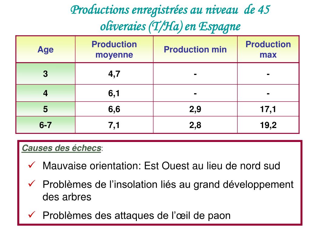 Productions enregistrées au niveau de 45 oliveraies (T/Ha) en Espagne • Causes des échecs: • Mauvaise orientation: Est Ouest au lieu de nord sud • Problèmes de l’insolation liés au grand développement des arbres • Problèmes des attaques de l’œil de paon