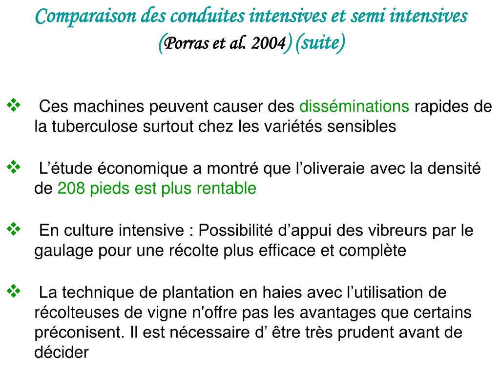 Comparaison des conduites intensives et semi intensives (Porras et al. 2004) (suite) • Ces machines peuvent causer des disséminations rapides de la tuberculose surtout chez les variétés sensibles • L’étude économique a montré que l’oliveraie avec la densité de 208 pieds est plus rentable • En culture intensive : Possibilité d’appui des vibreurs par le gaulage pour une récolte plus efficace et complète • La technique de plantation en haies avec l’utilisation de récolteuses de vigne n'offre pas les avantages que certains préconisent. Il est nécessaire d’ être très prudent avant de décider