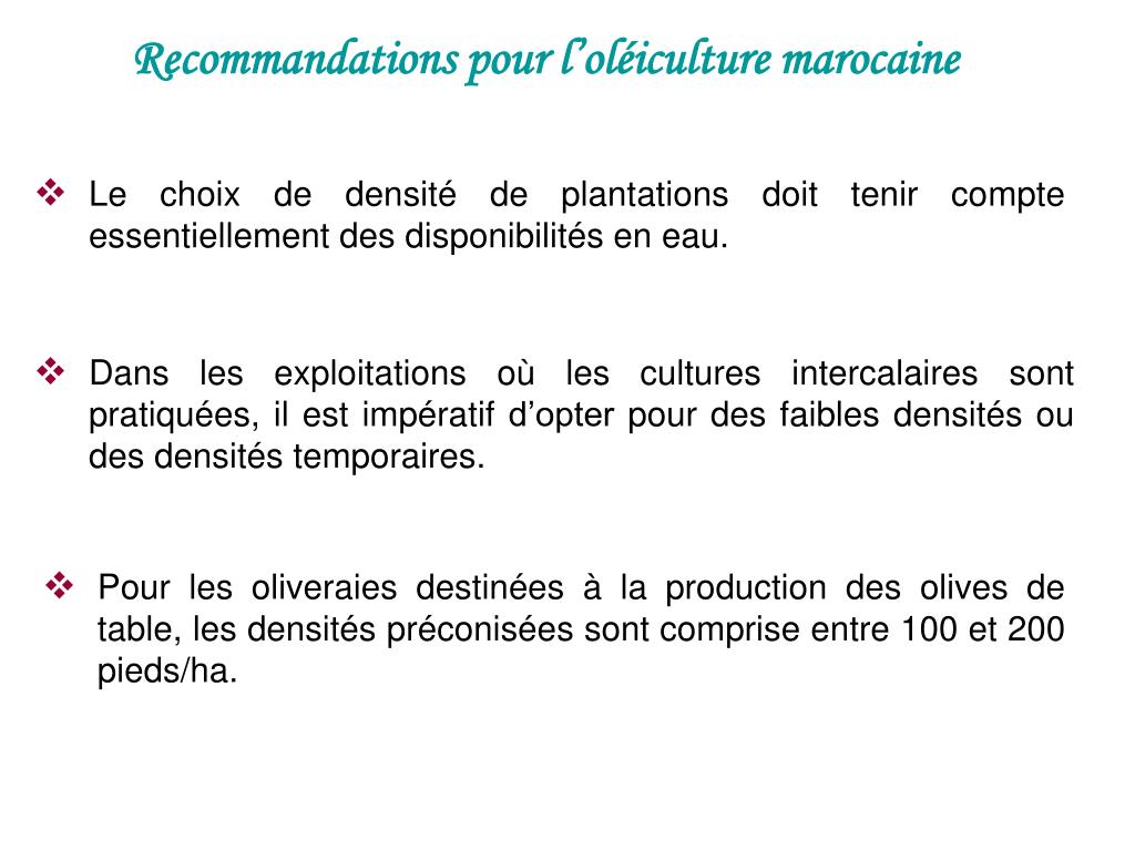 Recommandations pour l’oléiculture marocaine • Le choix de densité de plantations doit tenir compte essentiellement des disponibilités en eau. • Dans les exploitations où les cultures intercalaires sont pratiquées, il est impératif d’opter pour des faibles densités ou des densités temporaires. • Pour les oliveraies destinées à la production des olives de table, les densités préconisées sont comprise entre 100 et 200 pieds/ha.