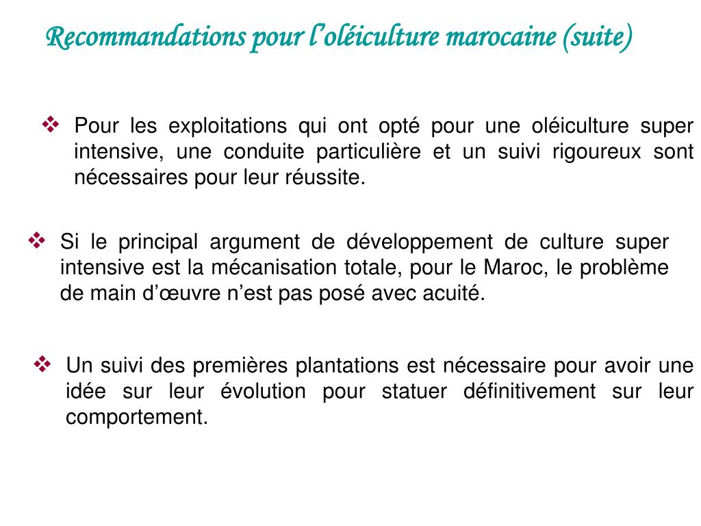 Recommandations pour l’oléiculture marocaine (suite) • Pour les exploitations qui ont opté pour une oléiculture super intensive, une conduite particulière et un suivi rigoureux sont nécessaires pour leur réussite. • Si le principal argument de développement de culture super intensive est la mécanisation totale, pour le Maroc, le problème de main d’œuvre n’est pas posé avec acuité. • Un suivi des premières plantations est nécessaire pour avoir une idée sur leur évolution pour statuer définitivement sur leur comportement.