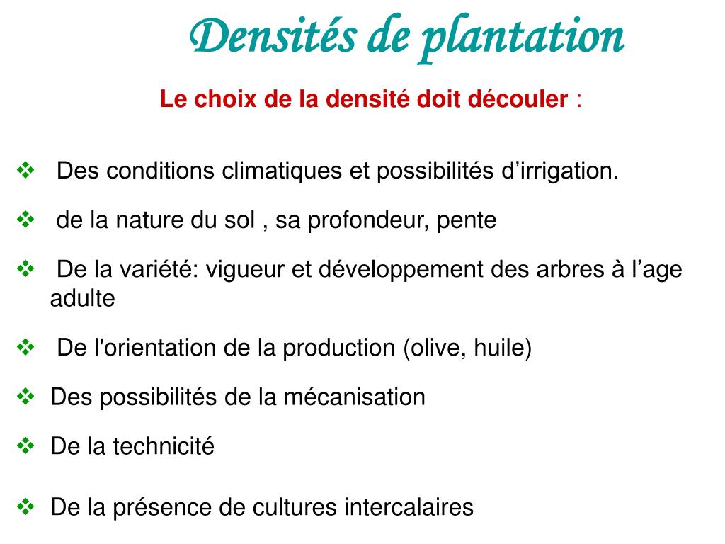 Densités de plantation • Le choix de la densité doit découler : • Des conditions climatiques et possibilités d’irrigation. • de la nature du sol , sa profondeur, pente • De la variété: vigueur et développement des arbres à l’age adulte • De l'orientation de la production (olive, huile) • Des possibilités de la mécanisation • De la technicité • De la présence de cultures intercalaires