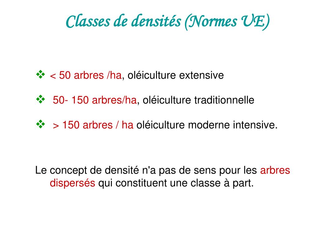 Classes de densités (Normes UE) • < 50 arbres /ha, oléiculture extensive • 50- 150 arbres/ha, oléiculture traditionnelle • > 150 arbres / ha oléiculture moderne intensive. • Le concept de densité n'a pas de sens pour les arbres dispersés qui constituent une classe à part.