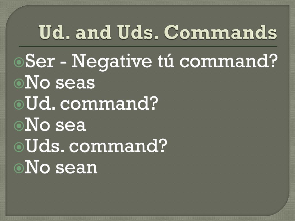Ud. and Uds. Commands • Ser - Negative tú command? • No seas • Ud. command? • No sea • Uds. command? • No sean