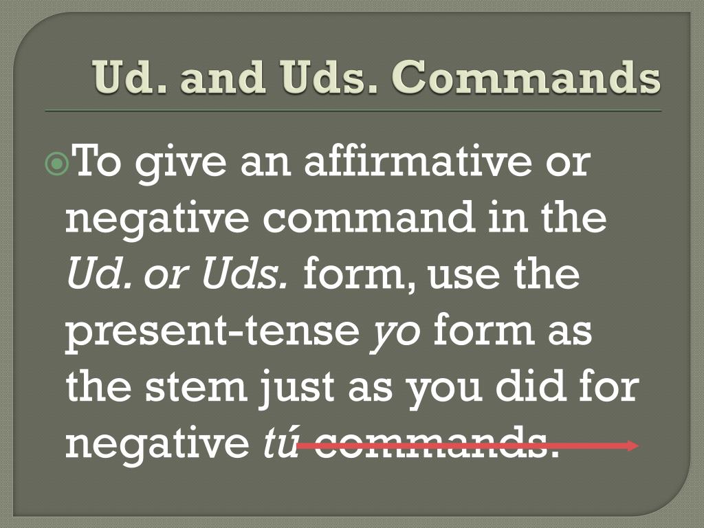 Ud. and Uds. Commands To give an affirmative or negative command in the Ud. or Uds. form, use the present-tense yo form as the stem just as you did for negative tú commands.