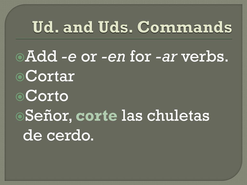 Ud. and Uds. Commands Add -e or -en for -ar verbs. Cortar Corto Señor, corte las chuletas de cerdo.