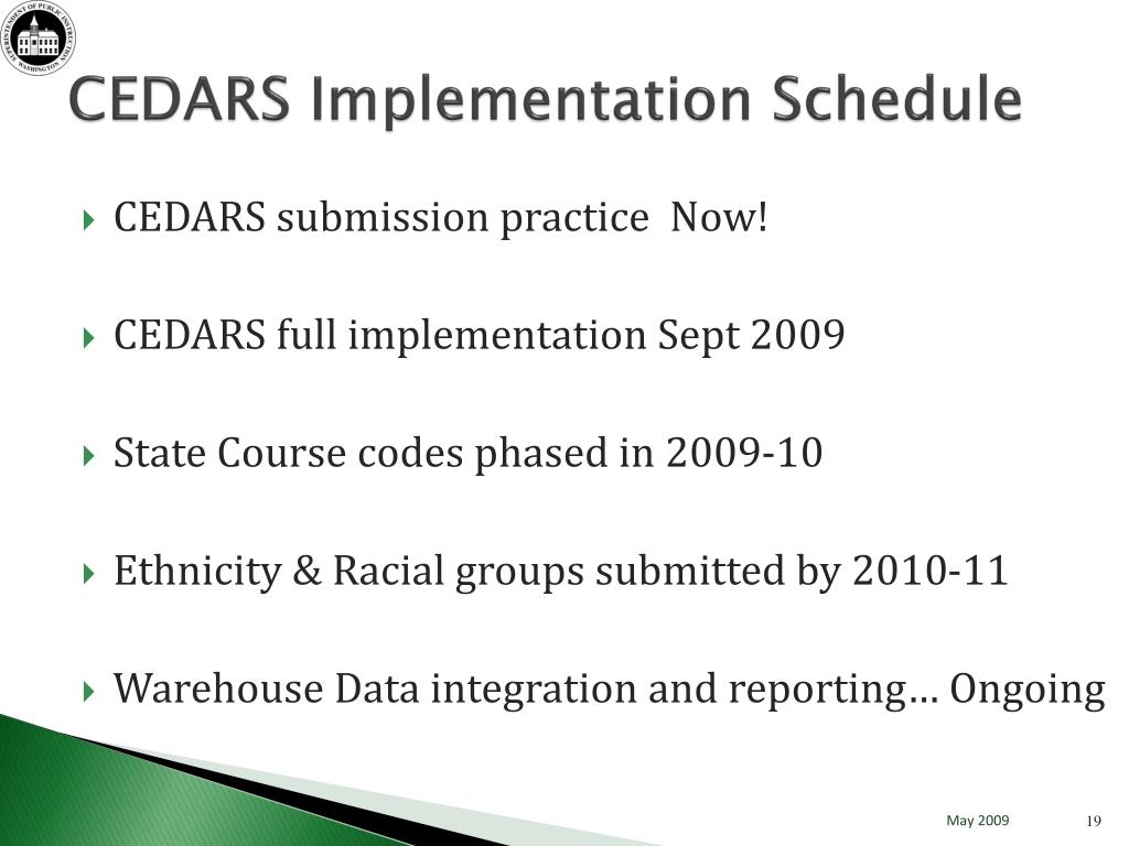 CEDARS Implementation Schedule • CEDARS submission practice Now! • CEDARS full implementation Sept 2009 • State Course codes phased in 2009-10 • Ethnicity & Racial groups submitted by 2010-11 • Warehouse Data integration and reporting… Ongoing May 2009