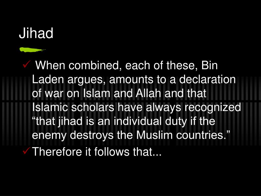 Jihad • When combined, each of these, Bin Laden argues, amounts to a declaration of war on Islam and Allah and that Islamic scholars have always recognized “that jihad is an individual duty if the enemy destroys the Muslim countries.” • Therefore it follows that...