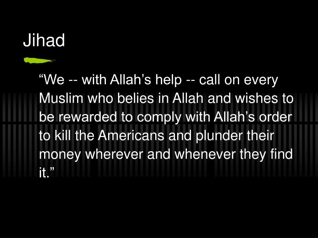 Jihad “We -- with Allah’s help -- call on every Muslim who belies in Allah and wishes to be rewarded to comply with Allah’s order to kill the Americans and plunder their money wherever and whenever they find it.”
