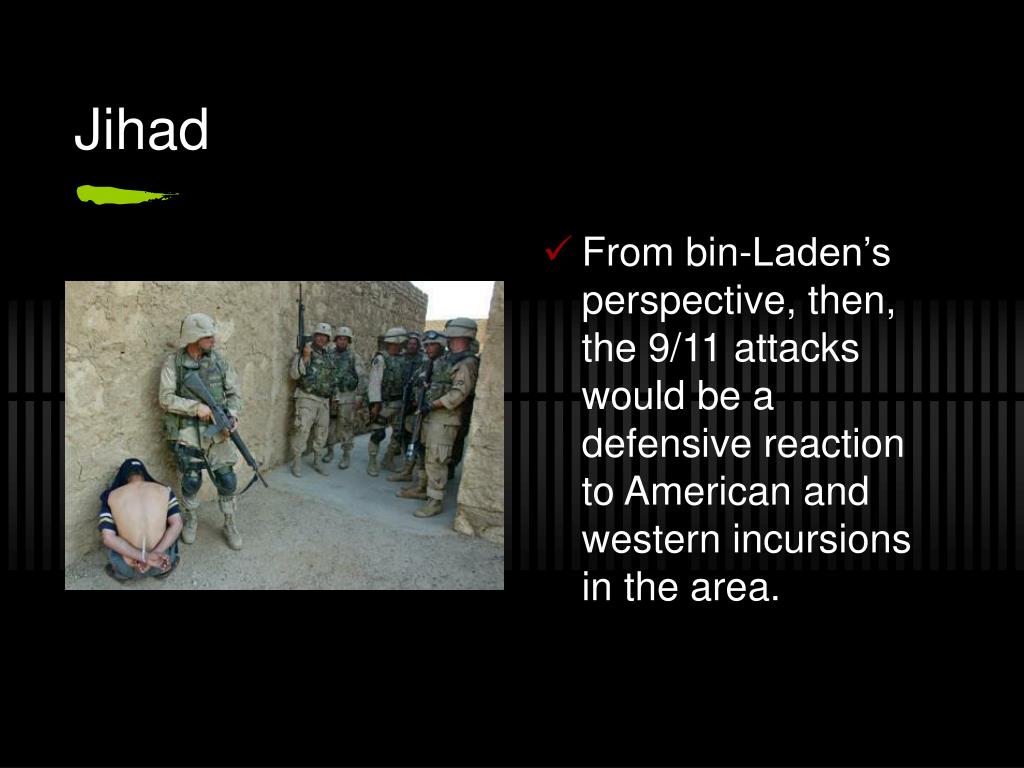 Jihad • From bin-Laden’s perspective, then, the 9/11 attacks would be a defensive reaction to American and western incursions in the area.