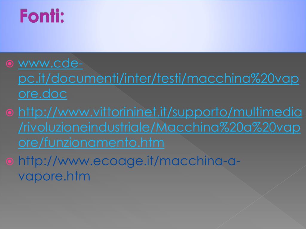 Fonti: • www.cde-pc.it/documenti/inter/testi/macchina%20vapore.doc • http://www.vittorininet.it/supporto/multimedia/rivoluzioneindustriale/Macchina%20a%20vapore/funzionamento.htm • http://www.ecoage.it/macchina-a-vapore.htm