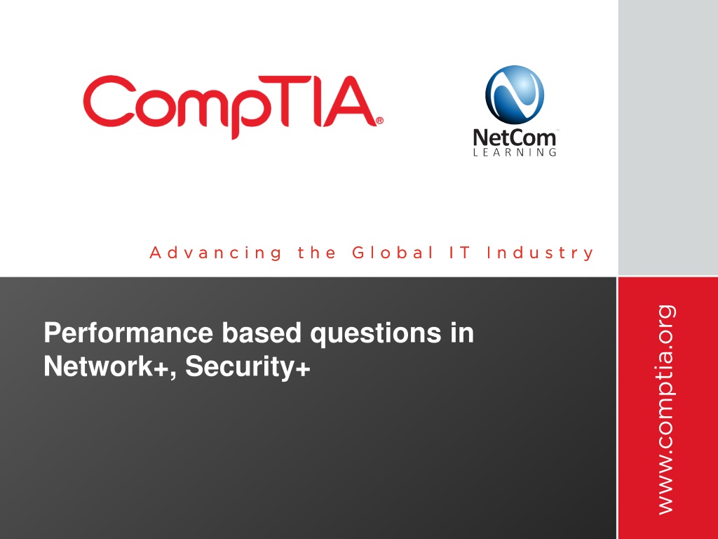 Timeframe and notes Performance based questions will be added to Network+ and Security+ on this schedule: • Network+: November 2012 • Security+: January 2013 • Same objectives • Same number of questions on exam (multiple choice will be reduced to accommodate performance based) • Hands-on training or experience becomes much more important