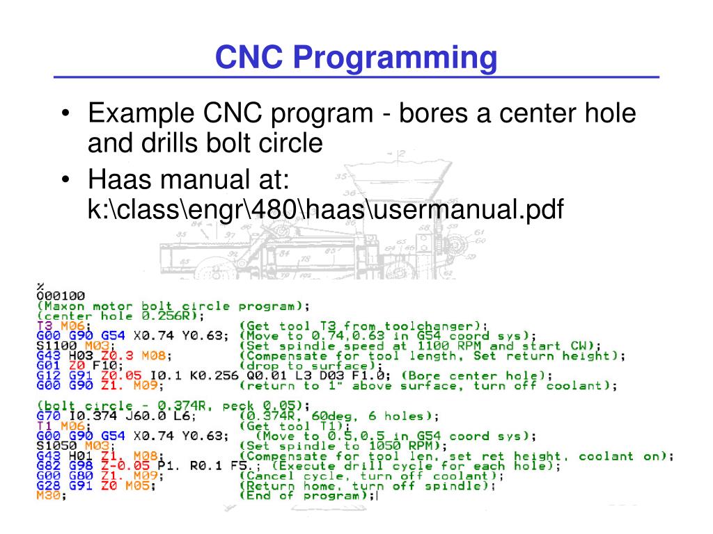 CNC Programming • Example CNC program - bores a center hole and drills bolt circle • Haas manual at: k:\class\engr\480\haas\usermanual.pdf