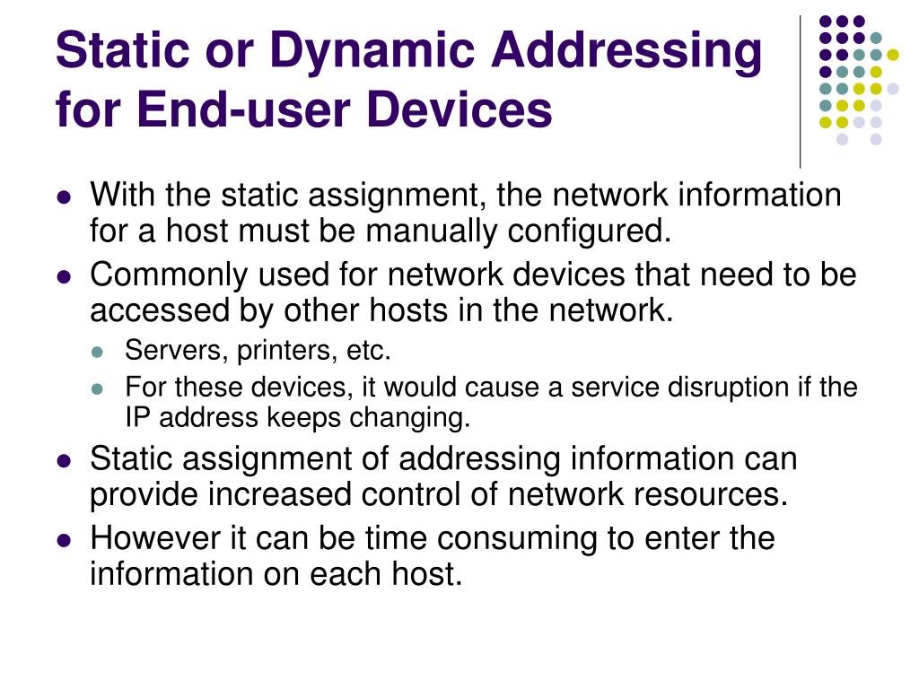 Static or Dynamic Addressing for End-user Devices • With the static assignment, the network information for a host must be manually configured. • Commonly used for network devices that need to be accessed by other hosts in the network. • Servers, printers, etc. • For these devices, it would cause a service disruption if the IP address keeps changing. • Static assignment of addressing information can provide increased control of network resources. • However it can be time consuming to enter the information on each host.