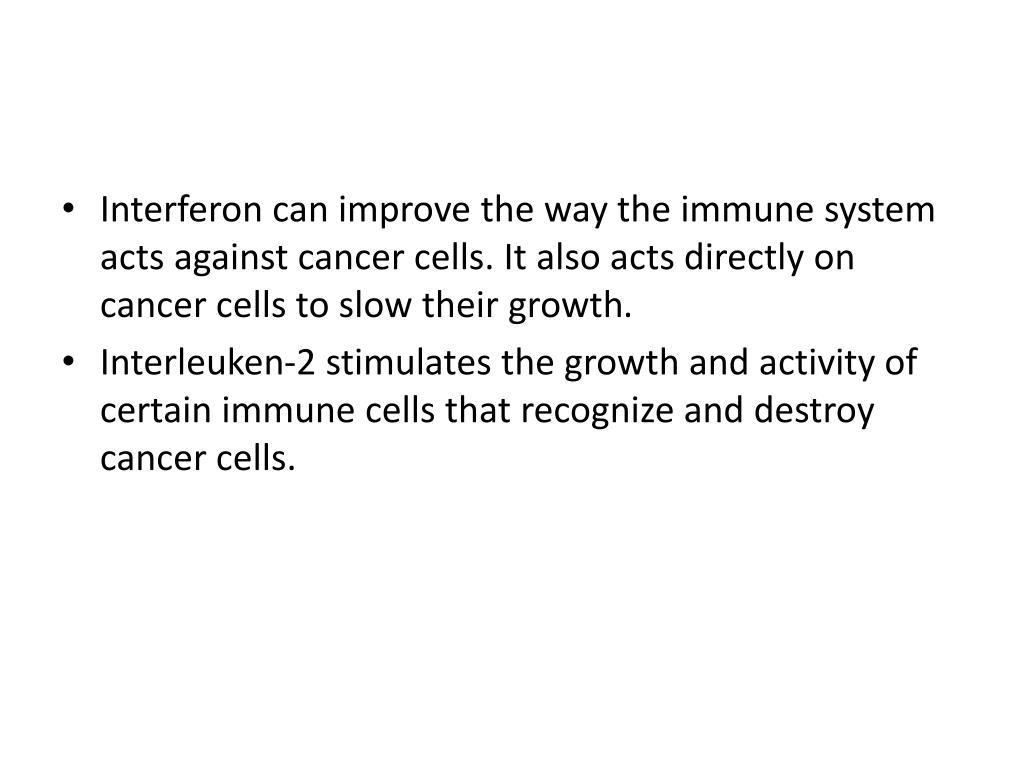 Interferon can improve the way the immune system acts against cancer cells. It also acts directly on cancer cells to slow their growth. • Interleuken-2 stimulates the growth and activity of certain immune cells that recognize and destroy cancer cells.