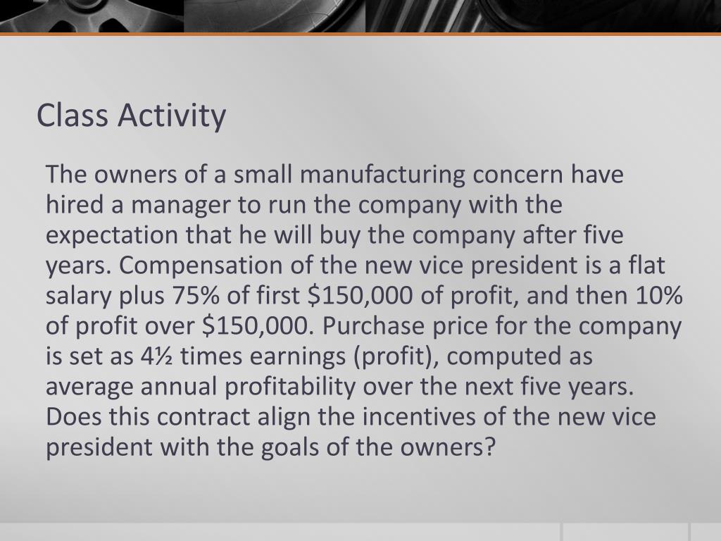 Class Activity The owners of a small manufacturing concern have hired a manager to run the company with the expectation that he will buy the company after five years. Compensation of the new vice president is a flat salary plus 75% of first $150,000 of profit, and then 10% of profit over $150,000. Purchase price for the company is set as 4½ times earnings (profit), computed as average annual profitability over the next five years. Does this contract align the incentives of the new vice president with the goals of the owners?