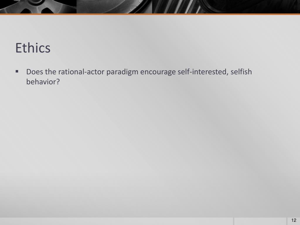 Ethics • Does the rational-actor paradigm encourage self-interested, selfish behavior?