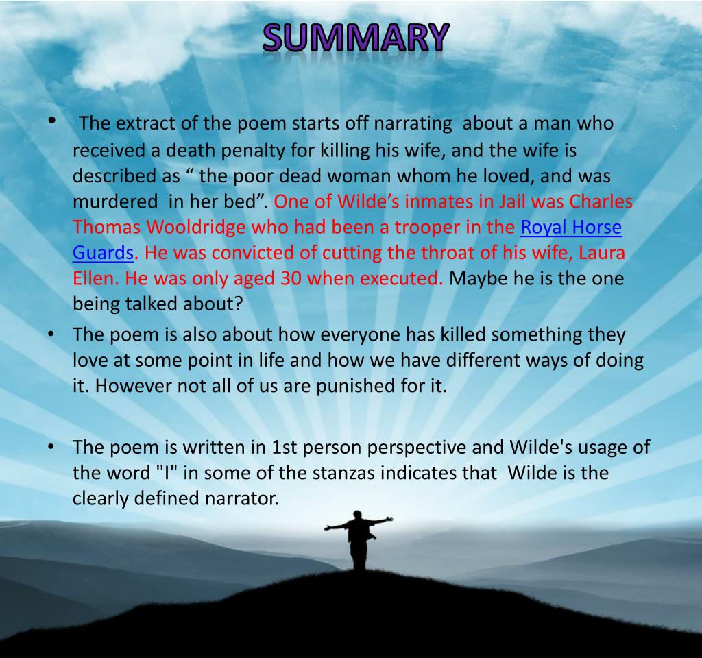 Summary • The extract of the poem starts off narrating about a man who received a death penalty for killing his wife, and the wife is described as “ the poor dead woman whom he loved, and was murdered in her bed”. One of Wilde’s inmates in Jail was Charles Thomas Wooldridge who had been a trooper in the Royal Horse Guards. He was convicted of cutting the throat of his wife, Laura Ellen. He was only aged 30 when executed. Maybe he is the one being talked about? • The poem is also about how everyone has killed something they love at some point in life and how we have different ways of doing it. However not all of us are punished for it. • The poem is written in 1st person perspective and Wilde's usage of the word "I" in some of the stanzas indicates that Wilde is the clearly defined narrator.