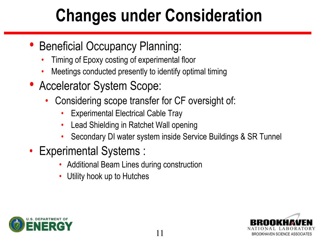 Changes under Consideration • Beneficial Occupancy Planning: • Timing of Epoxy costing of experimental floor • Meetings conducted presently to identify optimal timing • Accelerator System Scope: • Considering scope transfer for CF oversight of: • Experimental Electrical Cable Tray • Lead Shielding in Ratchet Wall opening • Secondary DI water system inside Service Buildings & SR Tunnel • Experimental Systems : • Additional Beam Lines during construction • Utility hook up to Hutches