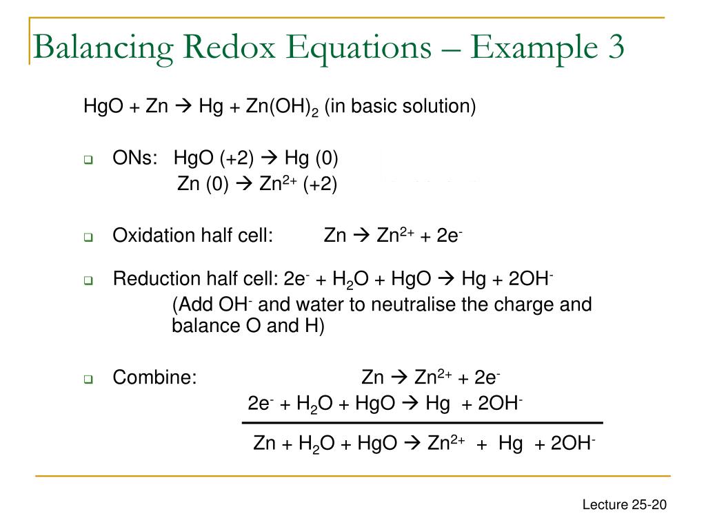 Balancing Redox Equations – Example 3 HgO + Zn Hg + Zn(OH)2 (in basic solution) • ONs: HgO (+2) Hg (0) Zn (0) Zn2+ (+2) • Oxidation half cell: Zn Zn2+ + 2e- • Reduction half cell: 2e- + H2O + HgOHg + 2OH- (Add OH- and water to neutralise the charge and balance O and H) • Combine: Zn Zn2+ + 2e- 2e- + H2O + HgOHg + 2OH- Zn + H2O + HgOZn2+ + Hg + 2OH- (reduction) (oxidation)
