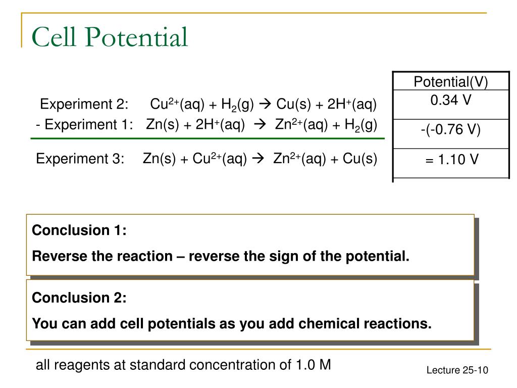 Potential(V) 0.34 V Zn(s) + 2H+(aq) Zn2+(aq) + H2(g) - Experiment 1: Cu2+(aq) + H2(g)Cu(s) + 2H+(aq) Experiment 2: -(-0.76 V) = 1.10 V Cell Potential Zn(s) + Cu2+(aq) Zn2+(aq) + Cu(s) Experiment 3: Conclusion 1: Reverse the reaction – reverse the sign of the potential. Conclusion 2: You can add cell potentials as you add chemical reactions. all reagents at standard concentration of 1.0 M