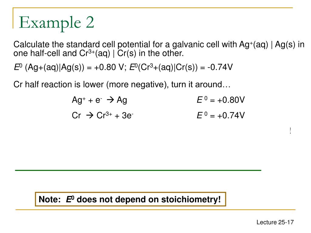 Note! Example 2 Calculate the standard cell potential for a galvanic cell with Ag+(aq) | Ag(s) in one half-cell and Cr3+(aq) | Cr(s) in the other. E0 (Ag+(aq)|Ag(s)) = +0.80 V; E0(Cr3+(aq)|Cr(s)) = -0.74V Cr half reaction is lower (more negative), turn it around… Ag+ + e- AgE 0 = +0.80V Cr Cr3+ + 3e- E 0 = +0.74V Balance the electrons… 3Ag+ + 3e- 3AgE 0 = +0.80V Cr Cr3+ + 3e- E 0 = +0.74V Cr(s) + 3Ag+(aq) Cr3+(aq) + 3Ag(s) E 0 = +1.54V Note: E0does not depend on stoichiometry!