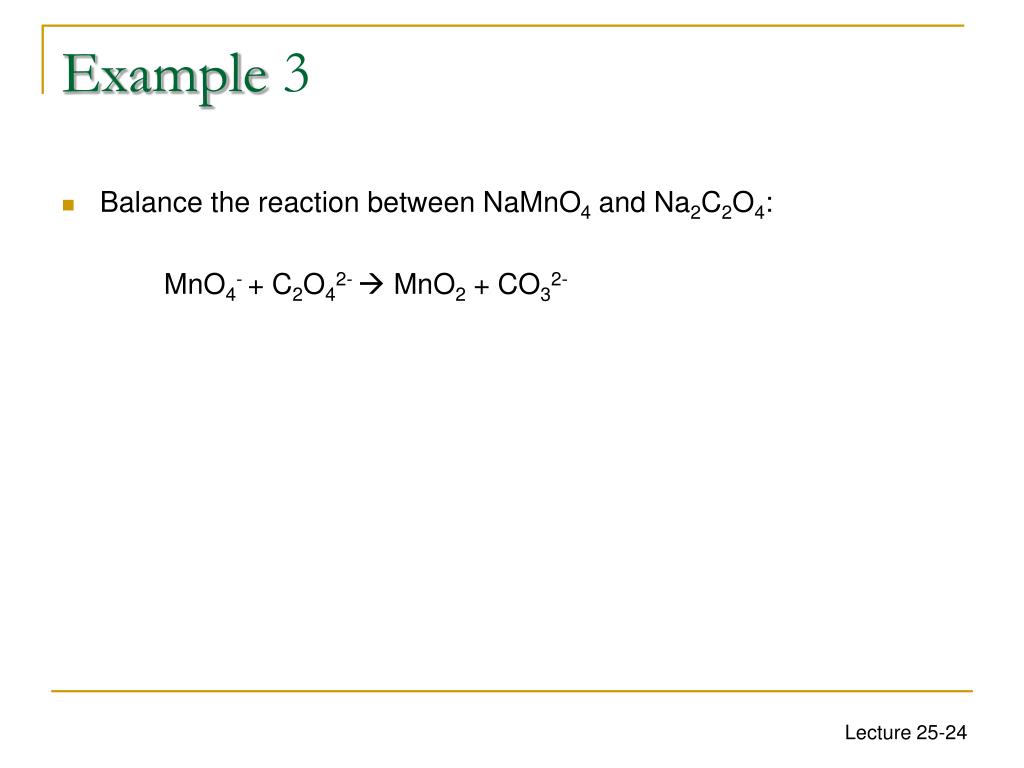Example3 • Balance the reaction between NaMnO4 and Na2C2O4: MnO4- + C2O42- MnO2 + CO32- Answer: 2 MnO4- + 3 C2O42-+ 2 H2O→ 2 MnO2 +6 CO32- + 4 H+