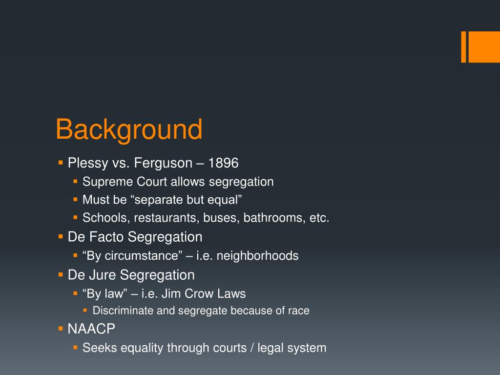 Background • Plessy vs. Ferguson – 1896 • Supreme Court allows segregation • Must be “separate but equal” • Schools, restaurants, buses, bathrooms, etc. • De Facto Segregation • “By circumstance” – i.e. neighborhoods • De Jure Segregation • “By law” – i.e. Jim Crow Laws • Discriminate and segregate because of race • NAACP • Seeks equality through courts / legal system