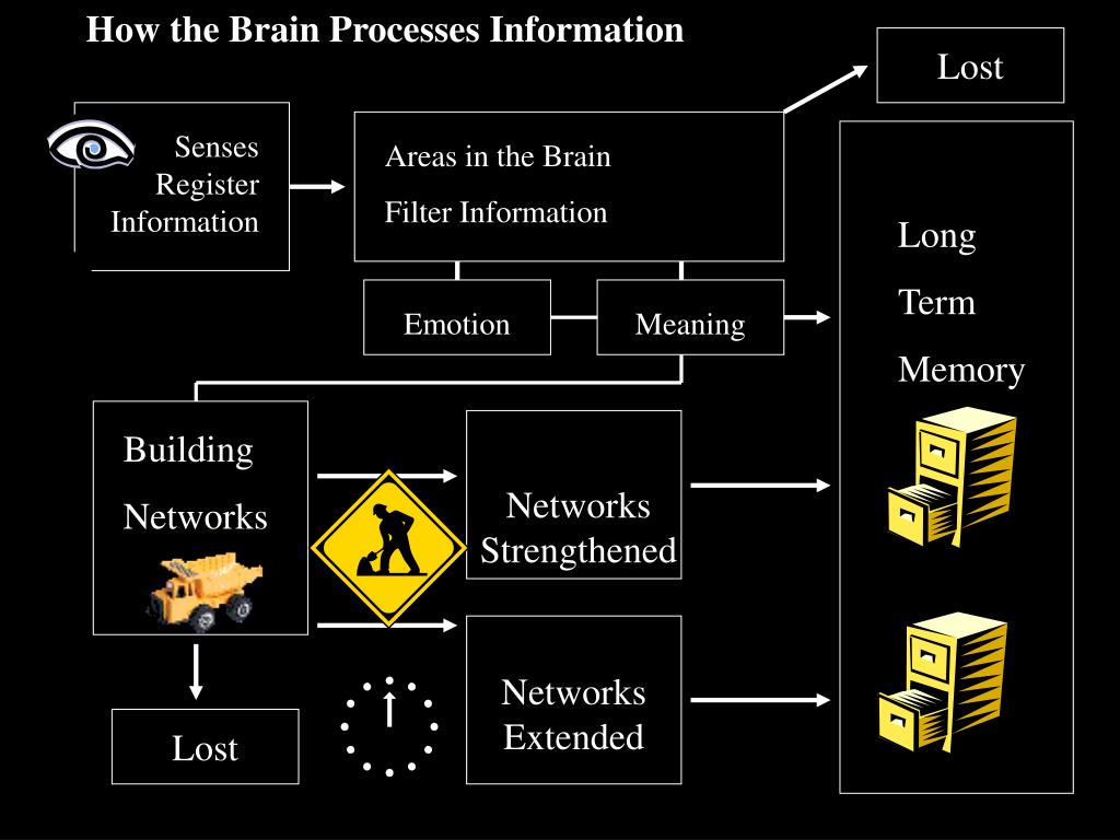 How the Brain Processes Information Senses Register Information Areas in the Brain Filter Information Emotion Meaning Networks Strengthened Lost Long Term Memory Building Networks Networks Extended Lost