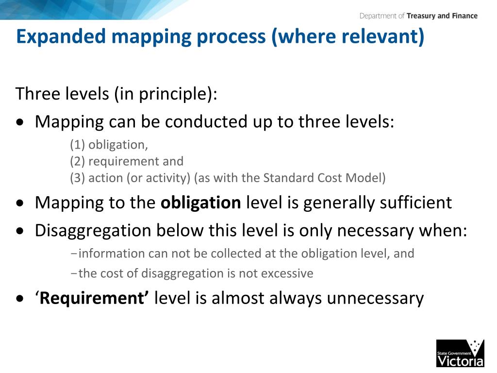 Expanded mapping process (where relevant) Three levels (in principle): • Mapping can be conducted up to three levels: (1) obligation, (2) requirement and (3) action (or activity) (as with the Standard Cost Model) • Mapping to the obligation level is generally sufficient • Disaggregation below this level is only necessary when: • information can not be collected at the obligation level, and • the cost of disaggregation is not excessive • ‘Requirement’ level is almost always unnecessary