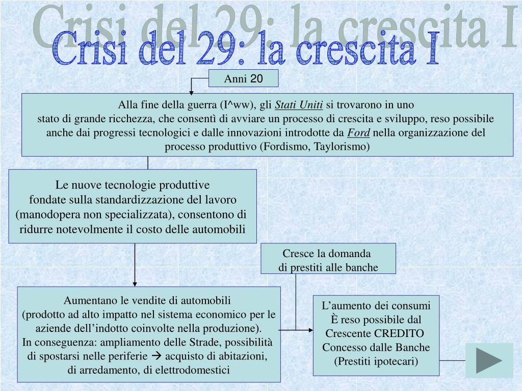 Crisi del 29: la crescita I Anni 20 Alla fine della guerra (I^ww), gli Stati Uniti si trovarono in uno stato di grande ricchezza, che consentì di avviare un processo di crescita e sviluppo, reso possibile anche dai progressi tecnologici e dalle innovazioni introdotte da Ford nella organizzazione del processo produttivo (Fordismo, Taylorismo) Le nuove tecnologie produttive fondate sulla standardizzazione del lavoro (manodopera non specializzata), consentono di ridurre notevolmente il costo delle automobili Cresce la domanda di prestiti alle banche Aumentano le vendite di automobili (prodotto ad alto impatto nel sistema economico per le aziende dell’indotto coinvolte nella produzione). In conseguenza: ampliamento delle Strade, possibilità di spostarsi nelle periferie acquisto di abitazioni, di arredamento, di elettrodomestici L’aumento dei consumi È reso possibile dal Crescente CREDITO Concesso dalle Banche (Prestiti ipotecari)