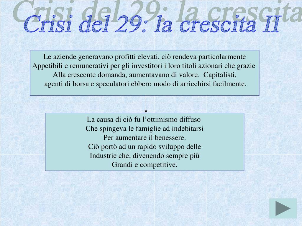 Crisi del 29: la crescita II Le aziende generavano profitti elevati, ciò rendeva particolarmente Appetibili e remunerativi per gli investitori i loro titoli azionari che grazie Alla crescente domanda, aumentavano di valore. Capitalisti, agenti di borsa e speculatori ebbero modo di arricchirsi facilmente. La causa di ciò fu l’ottimismo diffuso Che spingeva le famiglie ad indebitarsi Per aumentare il benessere. Ciò portò ad un rapido sviluppo delle Industrie che, divenendo sempre più Grandi e competitive.