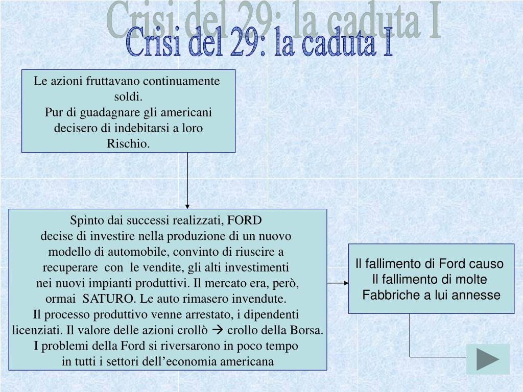 Crisi del 29: la caduta I Le azioni fruttavano continuamente soldi. Pur di guadagnare gli americani decisero di indebitarsi a loro Rischio. Spinto dai successi realizzati, FORD decise di investire nella produzione di un nuovo modello di automobile, convinto di riuscire a recuperare con le vendite, gli alti investimenti nei nuovi impianti produttivi. Il mercato era, però, ormai SATURO. Le auto rimasero invendute. Il processo produttivo venne arrestato, i dipendenti licenziati. Il valore delle azioni crollò crollo della Borsa. I problemi della Ford si riversarono in poco tempo in tutti i settori dell’economia americana Il fallimento di Ford causo Il fallimento di molte Fabbriche a lui annesse