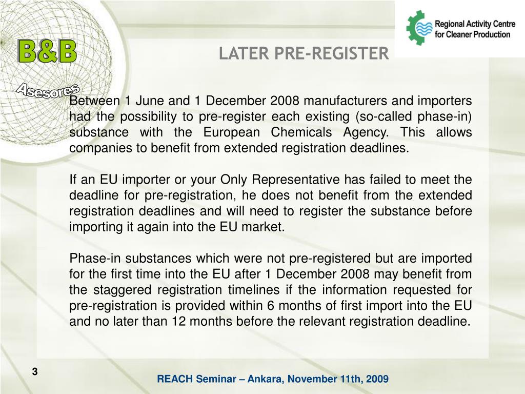 LATER PRE-REGISTER Between 1 June and 1 December 2008 manufacturers and importers had the possibility to pre-register each existing (so-called phase-in) substance with the European Chemicals Agency. This allows companies to benefit from extended registration deadlines. If an EU importer or your Only Representative has failed to meet the deadline for pre-registration, he does not benefit from the extended registration deadlines and will need to register the substance before importing it again into the EU market. Phase-in substances which were not pre-registered but are imported for the first time into the EU after 1 December 2008 may benefit from the staggered registration timelines if the information requested for pre-registration is provided within 6 months of first import into the EU and no later than 12 months before the relevant registration deadline.