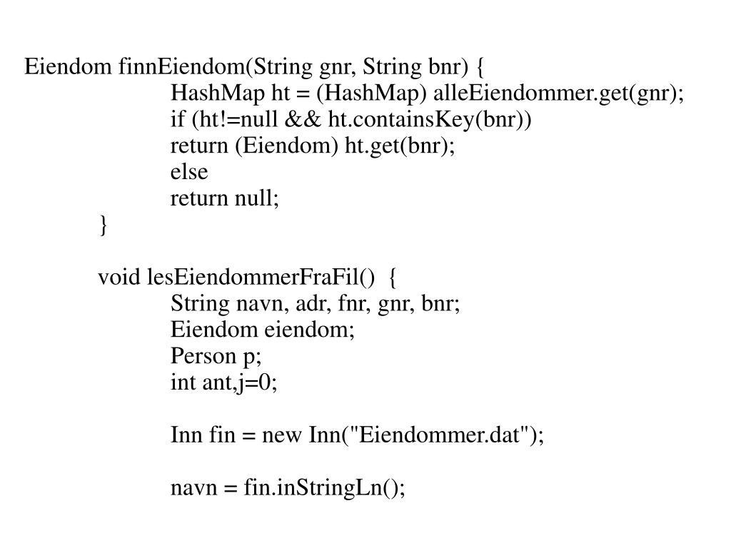 Eiendom finnEiendom(String gnr, String bnr) { HashMap ht = (HashMap) alleEiendommer.get(gnr); if (ht!=null && ht.containsKey(bnr)) return (Eiendom) ht.get(bnr); else return null; } void lesEiendommerFraFil() { String navn, adr, fnr, gnr, bnr; Eiendom eiendom; Person p; int ant,j=0; Inn fin = new Inn("Eiendommer.dat"); navn = fin.inStringLn();